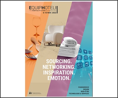 La prossima edizione di EquipHotel, la fiera internazionale leader per i professionisti del settore alberghiero e della ristorazione si svolgerà dal 6 al 10 novembre 2022 a Parigi Porte de Versailles, per scoprire tante novità di prodotto e servizi, per incontrare esperti e attori del settore CHR, per partecipare a convegni, workshop, masterclass, concorsi, scenografie e altri spazi esperienziali.