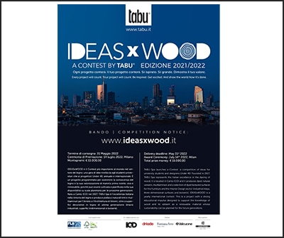 IDEASxWOOD, importante Contest nel settore del legno, promosso da TABU e patrocinato da ADI, FederlegnoArredo e FSC® Italia è una gara di idee, annuale e internazionale, rivolta sia agli studenti universitari, sia ai progettisti Under 40. Main partner è Carpanelli, storica azienda di Desio che produce arredi contemporanei ma fedeli ad un gusto classico ed elegante. IDEASxWOOD è un progetto con un forte slancio educativo, volto a sostenere la conoscenza del legno e la sua valorizzazione di materia prima nobile, viva e rinnovabile, perché il legno può essere coltivato e pianificato nella sua disponibilità su scala planetaria per le prossime generazioni. Il 31 maggio 2022 è la data entro cui devono essere presentati i progetti.