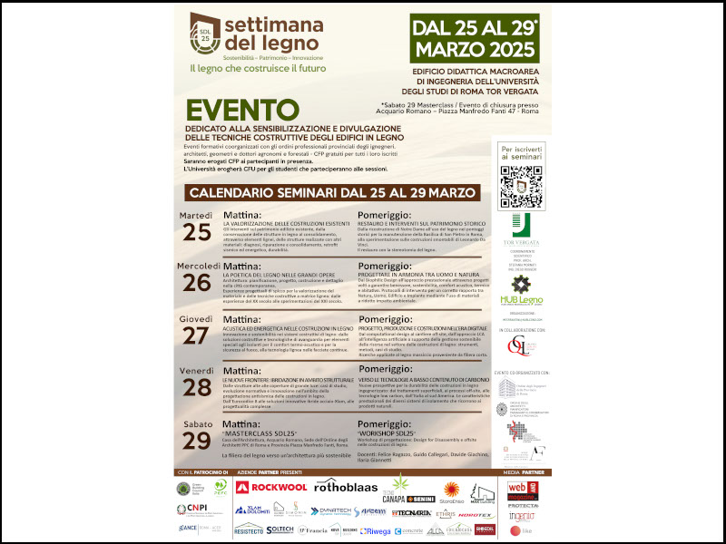 Dal 25 al 29 marzo 2025, si terrà presso l’Università degli Studi di Roma Tor Vergata, la Settimana del Legno 2025, dedicata alla sensibilizzazione e alla divulgazione delle tecniche costruttive degli edifici di legno.