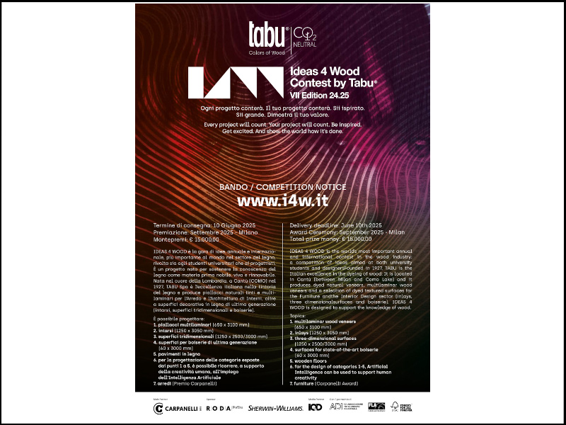 IDEAS4WOOD è il Contest più importante al mondo nel settore del legno, promosso da TABU e patrocinato da ADI, FederlegnoArredo e FSC® Italia: una gara di idee rivolta sia agli studenti universitari che ai progettisti di ogni età, annuale e internazionale. Main partner è Carpanelli di Desio (MI). Partner del progetto sono Sherwin Williams, eccellenza mondiale nel settore delle vernici, e Roda For You, azienda del miglior Made in Italy nei progetti di arredo a livello internazionale.