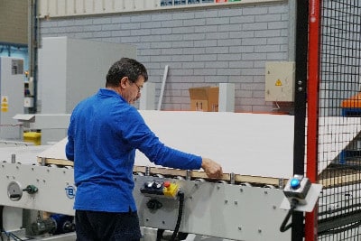 Il nucleo della porta è rivestito con colle PUR e raccolto da due morsetti che lo pongono sul pannello che l’operatore ha preparato. Va direttamente al tavolo successivo, dove l’operatore può adattare manualmente il pannello superiore e premere per garantire una finitura perfetta. La linea è semplice e l’operatore può passare dalla posa del pannello superiore a quello inferiore senza tempi di fermo.