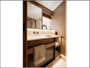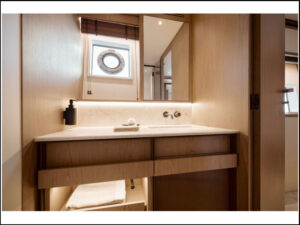 Per la rubinetteria di bordo è stata selezionata la Collezione Crown, scelta per la sua capacità di unire estetica e funzionalità coerentemente con il carattere dello yacht.