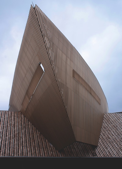 I circa 2.000 mq del rivestimento in legno sono stati realizzati e forniti da JOVE ed è stato volutamente lasciato al naturale, senza nessun tipo di trattamento protettivo; col tempo si ossiderà fino ad assumere un colore grigio uniforme. Queste pareti a nastro donano allo spazio delimitato grande flessibilità, fattore essenziale in una grande struttura che, come questa, accoglie una hall d’ingresso, tre auditorium, una sala polivalente, sale conferenze, uffici, un ristorante, un parcheggio sotterraneo e una copertura verde.