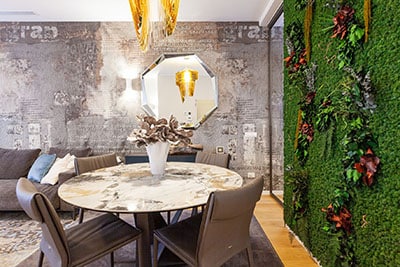CLM Design & Contract, General Contractor e Arredo Contract specializzato in ristrutturazioni in ambito residenziale e commerciale, ha realizzato un importante intervento di ristrutturazione completa, chiavi in mano, dalla progettazione all’Interior e Lighting Design, di un appartamento in zona Stazione Centrale, a Milano. Si tratta di un’abitazione connotata nella sua architettura indoor, da uno stile retrò tipico delle case di ringhiera meneghine del novecento: l’ingresso direttamente nel tinello, con angolo cottura, un bagno di servizio e spazi chiusi, volti a dividere la zona notte da quella giorno. “Mi sono affidato a CLM Design & Contract per chiedere un restyling totale dell’abitazione. Avevo bisogno di ripensarla completamente, nello stile e nella suddivisione degli ambienti, per renderla più funzionale alle nuove esigenze di vita, creando al contempo degli spazi di convivialità.” Racconta il proprietario dell’immobile. Elemento distintivo che funge da trait d’union tra la zona cucina e il living, è la suggestiva parete verde verticale, progettata da CLM e realizzata da maestri artigiani locali, che permette di ritrovare il contatto con la natura anche tra le mura domestiche. Un dettaglio decorativo raffinato e dall’elevata valenza estetica, che conquista al primo sguardo e che, all’occorrenza, separa la cucina dal soggiorno, grazie alla chiusura di due porte scorrevoli poste ai lati della stessa, realizzate in Stopsol super silver: una combinazione di materiali che alleggerisce altresì gli spazi, grazie anche all’effetto specchio che si genera a luci spente.