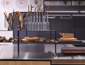 La linea minimal dell’impianto centrale a isola sottolinea l’attenzione al consumo intelligente di cui lo stesso Oldani è promotore attraverso un’idea di cucina antispreco che si risolve nel pensiero di fondo secondo il quale, per evitare gli eccessi, è necessario non produrne.