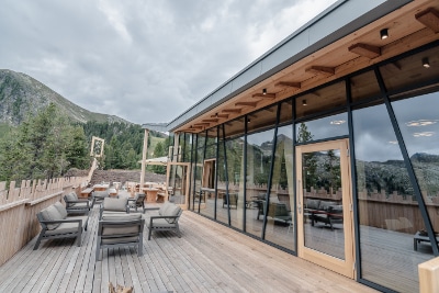 Le falde della copertura presentano pendenze diverse fra loro: un accorgimento progettuale che dona movimento sia nei prospetti che nella spazialità interna della sale ristorante. I progettisti hanno inoltre optato per una scelta in controtendenza con l’architettura montana, dotando le falde più estese del tetto di una inclinazione piuttosto bassa. Per questo motivo ha giocato un ruolo strategico la scelta di un rivestimento in alluminio di alta qualità, come il nastro aggraffato Prefalz di PREFA, in grado di assicurare un’elevata resistenza al vento forte e carichi di neve importanti, anche in presenza di falde poco inclinate. Lo stesso tipo di rivestimento in alluminio Prefalz, in una gradazione di grigio leggermente più scura rispetto a quello usato in copertura, è stato scelto per il rivestimento dei fronti nord e ovest e per quello della struttura che incornicia l’ingresso principale. Il nastro Prefalz in alluminio PREFA, materiale naturale completamente riciclabile, malleabile e facilmente lavorabile, è stato utilizzato per realizzare, oltre al rivestimento delle due facciate e della copertura, anche tutti i raccordi, le finiture e il cornicione sottotetto, le imbotti delle finestre e il rivestimento della pensilina sopra l’ingresso laterale. Anche nella scelta degli infissi, il metallo e il legno si avvicendano in un’alternanza equilibrata e originale.