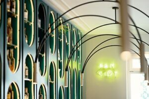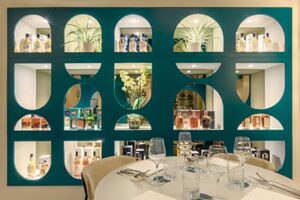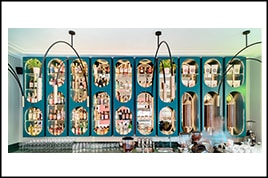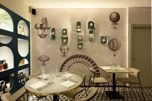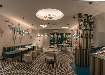Fanciot, fanciullo nel dialetto locale, è il dessert restaurant nel cuore di Alessandria che l’architetto Nick Maltese e il suo N+M Studio hanno disegnato come un contenitore onirico, uno spazio che porta ogni ospite fuori dal tempo, mescolando la sofisticata ricerca di forme e colori con dettagli illustrati che sanno di infanzia, di gioco e di dolcezza e parlano al bambino che ogni adulto custodisce: curioso, entusiasta, goloso di vita. La carta da parati è il primo elemento che connota lo spazio con le sue illustrazioni e immerge l’ospite in un paesaggio fantastico, dove una ruota panoramica vola accanto alle mongolfiere, mentre tartarughe, balene e animali fantasiosi sembrano lievitare nello spazio come in un diorama immaginifico dei primi ‘900. L’estetica scelta da Nick Maltese riprende le cromie e le suggestioni di quell’epoca e le trasferisce in un tempo senza tempo, contemporaneo perché eterno, come il fanciot dentro ognuno di noi. L’atmosfera è rarefatta e accogliente, un invito alla pace e a mettersi completamente a proprio agio per gustare, con la gioia di un bambino, i dolci al piatto preparati ad ogni ora o i pasticcini salati che accompagnano l’aperitivo, senza dimenticare la miscela di caffè, da cui il locale prende il nom,e e che è stata creata da Fabio Perugini, founder del vicino Melchionni Café e di Fanciot, mixologist e alchimista del caffé.