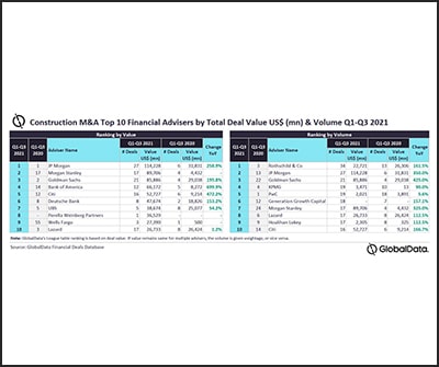 JP Morgan e Rothschild & Co sono stati i migliori consulenti finanziari per fusioni e acquisizioni (M&A) nel settore delle costruzioni per il Q1-Q3 2021, rispettivamente per valore e volume, secondo il Financial Deals Database di GlobalData, che afferma che JP Morgan ha fornito consulenza su 27 accordi per un valore di 114,2 miliardi di dollari, il valore più alto tra tutti i consulenti, mentre Rothschild & Co ha guidato, in termini di volume, avendo fornito consulenza su 34 accordi per un valore di 22,7 miliardi di dollari. Sono stati annunciati un totale di 3.001 accordi M&A nel settore durante il Q1-Q3 2021. Secondo il rapporto di GlobalData, ‘Global and Construction M&A Review and Financial Adviser League tables’, il valore dei deal per il settore è aumentato del 135,6% da 180 miliardi di dollari durante il Q1-Q3 2020 a 424 miliardi di dollari durante il Q1-Q3 2021.
