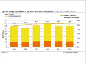 Secondo le analisi di CSIL, la domanda di mobili in Europa dovrebbe rimanere sostanzialmente invariata nel 2025, con un lieve miglioramento previsto nel medio termine. Tra i fattori favorevoli che potrebbero stimolare una ripresa ci sono un modesto miglioramento degli indicatori macroeconomici, una prevista diminuzione dell’inflazione e dei tassi d’interesse, oltre a un possibile aumento dei salari. Questi elementi potrebbero contribuire a rafforzare la fiducia dei consumatori e a incentivare la spesa nel settore del mobile.