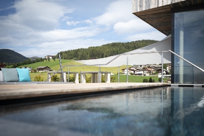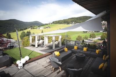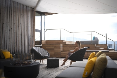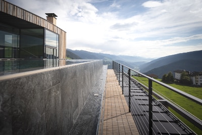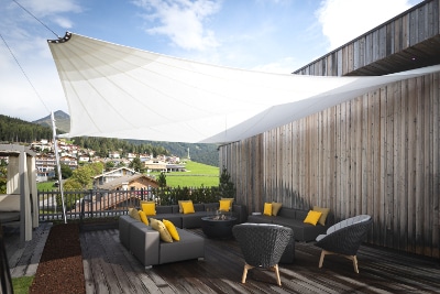Immerso tra le malghe di Gitschberg-Jochtal in Alto Adige, a quota 1.400 m, si trova l’Alpine Lifestyle Hotel Ambet, un resort 4 stelle nell’altopiano di Maranza, che vanta una spettacolare vista sulle Dolomiti di Sesto. A seguito di un’importante ristrutturazione avvenuta nel 2017, l’Hotel Ambet combina un’architettura leggera con ampie vetrate e materiali naturali, a elementi di modernità come il centro benessere e la piscina a sfioro Infinity Sky Pool sulla terrazza, ideale per godersi il panorama alpino cullati dalle onde. La proprietà desiderava creare una nuova area relax esterna, in armonia con lo stile essenziale del resort. Dopo un’accurata valutazione, lo studio Piller – Scartezzini di Bolzano, incaricato del progetto, ha optato per la vela ombreggiante KHEOPE della linea SAILS di KE. Apprezzata per i materiali di derivazione nautica, resistenti all’usura come il Dacron, e per il senso di leggerezza che esprime, KHEOPE è stata scelta dal progettista nella versione appoggiata a parete per limitare l’uso dei pali di supporto e dar maggior risalto al panorama, mantenendo un’estetica minimalista. KHEOPE si configura con una movimentazione motorizzata dotata di anemometro che ne assicura la chiusura automatica in caso di forte vento. Il decking in legno delimita l’area relax e nasconde i fissaggi dei pilastri, preservando un’assoluta funzionalità. L’ampia zona coperta dalla vela – il cui boma supera i 9 metri – funge anche da scenica per incorniciare il panorama alpino. Vele ombreggianti, tende da sole e pergole ideate per creare vere e proprie oasi di relax su misura, secondo le esigenze del committente, le soluzioni outdoor di KE uniscono qualità dei materiali, design attentamente studiato e ricerca di prodotto. L’outdoor diventa così uno spazio di puro comfort, in grado di enfatizzare e massimizzare gli spazi utilizzabili da hotel, bar, ristoranti e negozi.