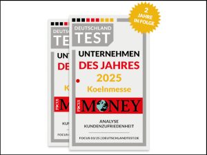 Koelnmesse è stata nominata ‘Azienda dell’anno’ sia nel 2024, sia nel 2025 da DEUTSCHLAND TEST e FOCUS MONEY in uno studio condotto dall’Istituto per la Ricerca Economica e Gestionale (IMWF).