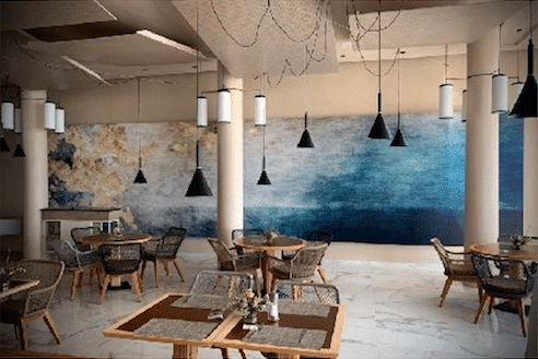Il ristorante dell’hotel della catena svizzera Movenpick di Tunisi con vista sulla baia è stato ristrutturato dagli interior designer francesi Patrice e Olivier HART, che hanno utilizzato un ‘affresco’ firmato ABITAdecò e studiato e realizzato appositamente per questa location.