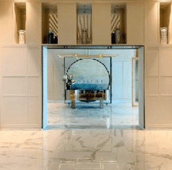 Lo scontro di cielo e mare è stato trasportato nell’ampia quinta teatrale in una reinterpretazione astratta e moderna. I colori più che evocativi si fondono, si scontrano e si mescolano con la forza e la potenza che solo madre natura può sfoggiare. Acque profonde di colori e di storia; spumose, agitate, le storiche acque del Mediterraneo. All’ingresso del ristorante, l’installazione-logo Horizon, che i designer hanno realizzato come complemento della zona di accoglienza degli ospiti.
