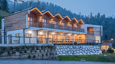 La Locanda Giallo a Pieve di Cadore richiama gli elementi in cui è immersa, già nel nome: giallo come l’oro del sole e dei fiori dolomitici. La struttura dell’hotel, realizzato da Rubner Haus, è in legno si estende lungo la parte meno ripida di un pendio; è un edificio compatto, ad alta efficienza energetica, con l’energia termica alimentata da una centrale a biomassa integrata ai pannelli fotovoltaici. All’interno dei tre piani il tema dominante è la Natura intesa come esperienza, a cominciare dal contatto con il legno, materiale naturale per eccellenza, impiegato per tutto, dai rivestimenti agli arredi fino ai lampadari. Le camere sono identificate da un fiore o da una pianta, e immagini di fiori e spezie sostituiscono numeri e codici per orientare gli ospiti in tutta la struttura. C’è una biblioteca tematica alpina, e i prodotti dell’agricoltura locale connotano lo shop, mentre sul prato circostante è possibile vedere le fioriture delle famose spezie delle Dolomiti, in un ambiente sensoriale di profumi e colori. Aromi ed erbe dolomitiche sono anche le protagoniste dell’hortus in serra, così come delle coltivazioni pensili. Al piano seminterrato il centro benessere ha due saune e una zona relax dalle grandi vetrate sul solarium panoramico e sulla serra.