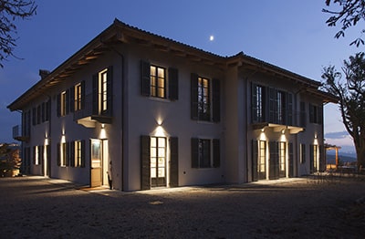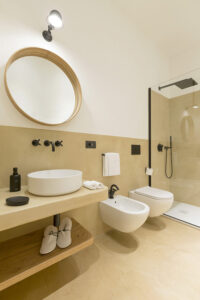 L’Agriturismo dai Grésy in Langa, sui colli delle Langhe, sorge sulle basi di un’antica cascina, con una superficie di circa 1500 mq, che comprende undici camere, di cui due suite, una sala eventi e meeting con vista panoramica, una sala degustazione dove assaporare i vini dell’azienda Tenute Cisa Asinari dei Marchesi di Grésy, produttori di Barbaresco. Protagonisti del progetto architettonico, firmato da Elena Bellincioni, sono i materiali, scelti per sottolineare il legame con il contesto naturale in cui la struttura si trova: legno, ferro, pietra, muri dipinti a calce e cocciopesto colorato in pasta dialogano armoniosamente tra loro, creando ambienti molto accoglienti. Il living, che si raccoglie intorno al camino, proprio come in una cascina di famiglia, è caratterizzato dagli arredi disegnati da EMB e realizzati da artigiani locali, dalle grandi porte-finestra, da cui la luce entra a illuminare gli spazi, filtrata da scultorei frangisole in legno. Tutto racconta una grande passione per il luogo, per la sua storia e per le sue caratteristiche, naturali e umane, da valorizzare rispettandolo. Per i bagni di tutte le camere è stata scelta la rubinetteria Dornbracht, installando la serie TARA in nero opaco, che spicca – con la sua linea elegante e inconfondibile – come un deciso segno grafico sul cocciopesto colorato in pasta che fa da sfondo. Ad accogliere gli ospiti, inoltre, una spa – con sauna, bagno turco, vasca idromassaggio, docce e zona relax, sale massaggi e palestra – completa una vacanza dedicata al relax. Anche in questo caso la scelta della progettista è caduta su Dornbracht, in particolare su Meta, dalle linee pulite e forme essenziali, su Mem, dal design sempre attuale, e ancora una volta sul minimalismo raffinato di Tara, questa volta in versione cromata. All’esterno, la piscina in pietra leggermente cangiante, a sfioro sulle vigne, crea giochi e riflessi con i raggi del sole, mentre l’ingresso alla spa è una nicchia rivestita in profumato legno di cedro.
