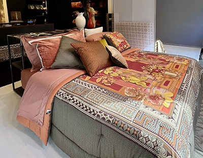 L’ambientazione è realizzata con la linea Evoè di Reevèr, di esclusiva manifattura italiana, che si compone di tessili arredo casa e tendaggi di alta gamma della nuova collezione Reevèr Fabric.