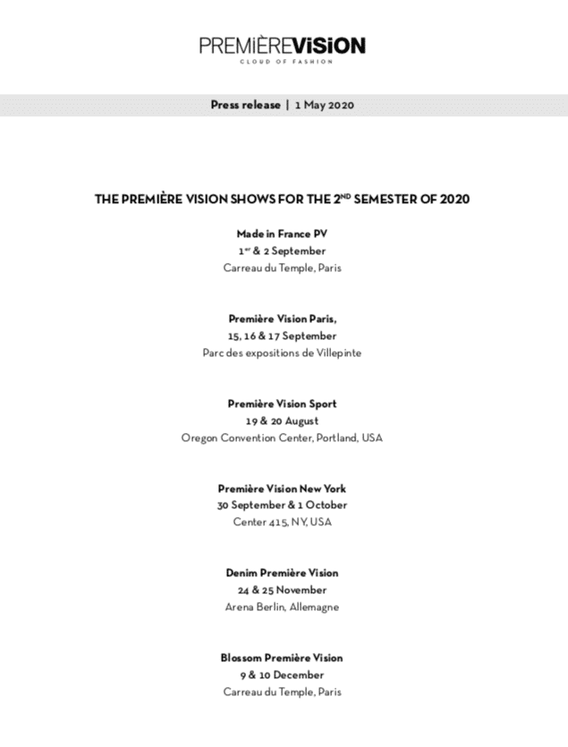 Alla luce della crisi sanitaria ed economica che il mondo ha vissuto nelle ultime settimane, Première Vision ha preso una posizione ferma nel prendere un forte impegno strategico per un settore della moda fortemente colpito. In un’espressione di solidarietà con i suoi espositori e marchi, il gruppo ha lanciato una serie di misure per supportare attivamente e assistere il settore nella preparazione per la ripresa delle attività commerciali.