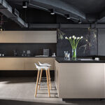 Le lampade Mirage, disegnate da Bastien Taillard, sono state scelte nell’elegante finitura color bronzo; la particolare lavorazione del vetro martellato, realizzata artigianalmente a mano, conferisce alla superficie delle cupole-riflettori un effetto ondulato e riflessi mutevoli che ricordano quelli di uno specchio d’acqua.