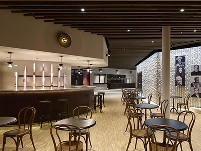 Le lampade Mirage di Radar illuminano il foyer dell’Octogone Théâtre a Losanna. Fortemente riconoscibile grazie al suo distintivo volume geometrico in cemento scalpellato, il teatro è dotato di una sala con 455 posti che ospita decine di rappresentazioni ogni anno e di uno studio di danza. Recentemente, il foyer e l’area bar-ristorante sono stati oggetto di ristrutturazione su progetto dello studio SAS Architecture in collaborazione con Alexandre Boyer. Le pareti portanti, caratterizzate dalla stessa lavorazione a scalpello dell’esterno, si sposano con l’ambiente caldo e accogliente, arredato con sedie in legno e tavolini da bistrot. Sull’area comune si aprono i banconi del bar, della biglietteria e del guardaroba, sottolineati da un ribassamento in cartongesso chiaro ritmato dalla presenza della applique Radar e illuminati dalle sospensioni del brand italo-francese.