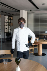 Nel progetto di riapertura del ristorante D’O di Davide Oldani, ogni intervento – dalla sanificazione, alle mascherine, guanti e occhiali per chi lavora in sala e in cucina, agli arredi stessi – è stato studiato e calibrato per garantire la massima sicurezza per tutti.