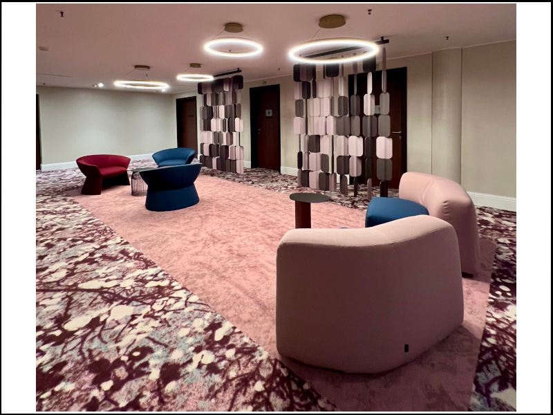 Il restyling del centro congressi è stato effettuato dallo studio Chiara Caberlon, con l’intento di rendere le sale riunioni più accoglienti e confortevoli, introducendo un’area break adiacente che prima mancava. Il progetto è stato suddiviso in due fasi: nella prima è stata posata una pavimentazione effetto legno con un materassino per ridurre i rumori di calpestio e rinnovata la carta da parati. La seconda fase ha enfatizzato l’impegno di GDF Hotel per la sostenibilità, procedendo al relamping di tutte le sale, compresa l’area break e il corridoio, con l’installazione di illuminazione LED. Inoltre, il pavimento esistente nelle aree comuni è stato sostituito da moquette, seguendo gli standard Hilton.