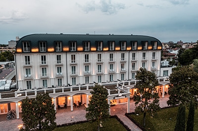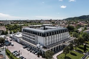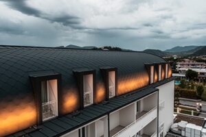 L’Hotel Première di Abano Terme è stato recentemente oggetto di un intervento di ristrutturazione e restyling, che ha trasformato le eterogenee strutture esistenti in un corpo architettonico armonico, dall’estetica ricercata e con spazi e volumetrie redistribuite per ottimizzare la vivibilità degli ambienti. Nel progetto di ristrutturazione curato dallo Studio Miotto, lo stile liberty della facciata principale è stato valorizzato ed esaltato, realizzando una nuova copertura caratterizzata da volte a botte e deliziosi abbaini, che ha preso il posto di un’anonima copertura a doppia falda con copertura in tegole. Per il rivestimento della copertura la scelta dei progettisti si è orientata da subito sull’alluminio, un materiale leggero e malleabile, che ben riusciva a assecondare le forme sinuose delle volute e le variegate pendenze delle superfici di copertura, garantendo sempre la perfetta impermeabilità. Da qui hanno optato per Scaglia 44 di PREFA, la cui orma geometrica romboidale con le sue linee diagonali, risultava perfetta per dare espressione allo stile Liberty e movimento alle superfici. Inoltre il colore scuro antracite con verniciatura P.10 costituiva un deciso richiamo all’architettura francese, creando, inoltre, un piacevole accento, in contrasto con le candide facciate. Il grande formato della Scaglia 44 è stato apprezzato per la maggiore rapidità di montaggio e omogeneità delle superfici, nel rivestire ampie metrature. Inoltre, per il rivestimento degli abbaini e per il loro raccordo alla copertura e alle facciate sottostanti è stato utilizzato il nastro Prefalz di Prefa, nella stessa colorazione antracite P.10, creando un effetto estetico estremamente curato ed omogeneo, oltre ad assicurare l’ottimale impermeabilizzazione di tutti i punti di giunzione. Ogni dettaglio di rivestimento e collegamento dei corpi emergenti è stato accuratamente progettato a monte, realizzando un prototipo in cantiere, utilizzato come riferimento per ottimizzare poi tutte le lavorazioni successive. L’accurata progettazione esecutiva dei dettagli di cantiere, la versatilità e la facilità di lavorazione dei materiali Prefa ha permesso di procedere speditamente con la realizzazione del rivestimento degli oltre 3.500 mq di coperture, conclusa in soli 3 mesi da un team di 8 persone. Inoltre, la grande superficie della Scaglia 44 consente di coprire 1 m2 con soli 5 elementi, velocizzando le operazioni.
