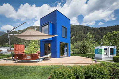 La blu HouseBoat, firmata da Lucio Micheletti per Rubner Haus, in val Pusteria