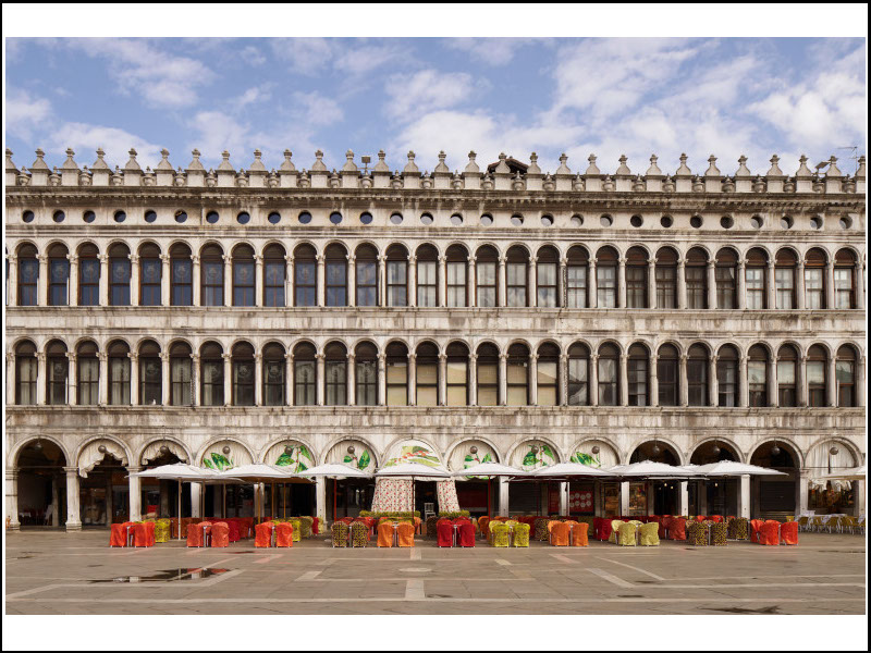 Per la prima volta nella storia della Biennale, un’installazione artistica esce dai confini tradizionali degli spazi espositivi per integrarsi nel tessuto vivo di Piazza San Marco. Il progetto trae ispirazione dalle antiche rotte del caffè e dal loro profondo impatto sulla storia e la cultura della Serenissima. L’intervento trasforma temporaneamente l’aspetto del Plateatico del Gran Caffè Quadri, senza interrompere la sua consueta attività.